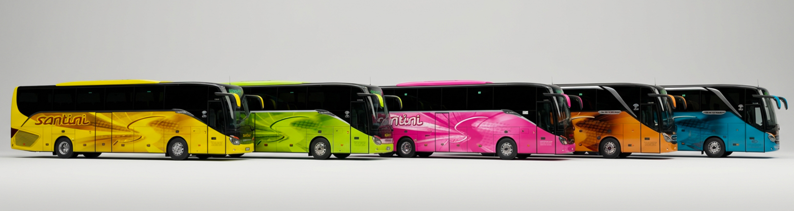 Una delle caratteristiche più distintive della flotta Santini Viaggi è la scelta di personalizzare ogni autobus con un colore diverso.