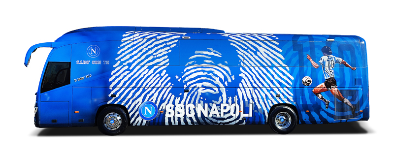 Successivamente abbiamo avuto l’onore di wrappare il nuovo pullman del Napoli nell’anno in cui la squadra partenopea è tornata al successo come campione d’Italia. Elemento identitario al centro della livrea non poteva essere altri che lui: El Diez, Diego Maradona.